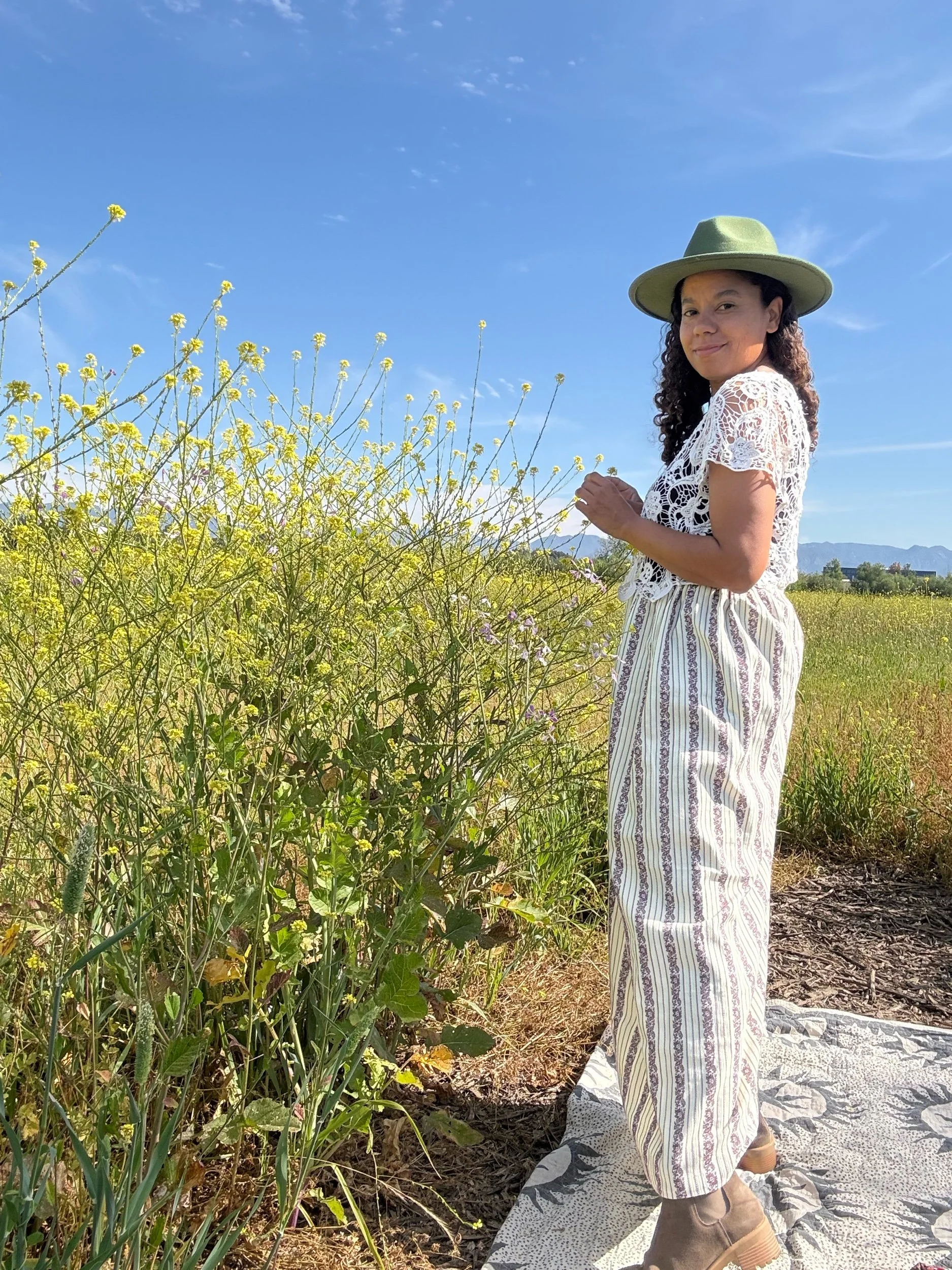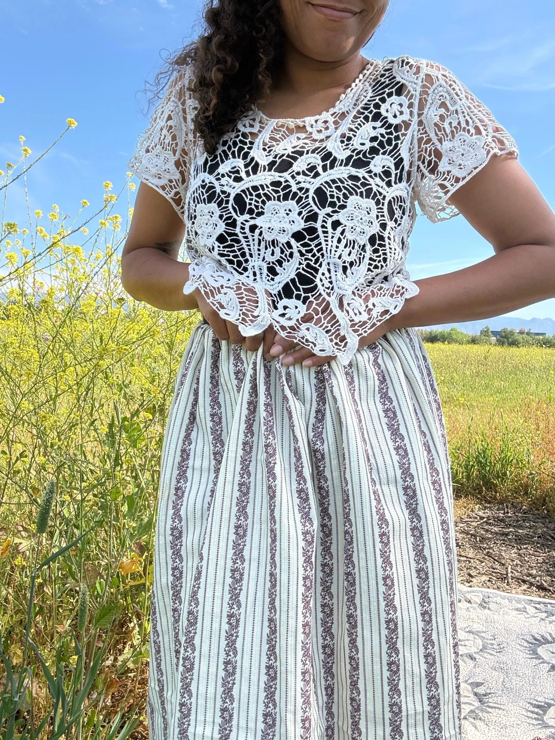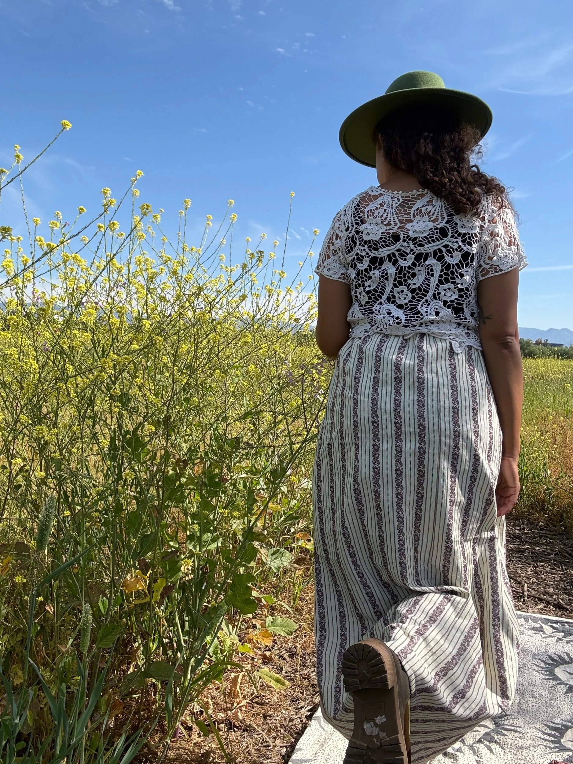 You can dress her up, or dress her down. A unique vintage fabric with a couple of nearly invisible spots, reflected in the price. Gorgeous for brunch, or a long breezy stroll at dusk.
