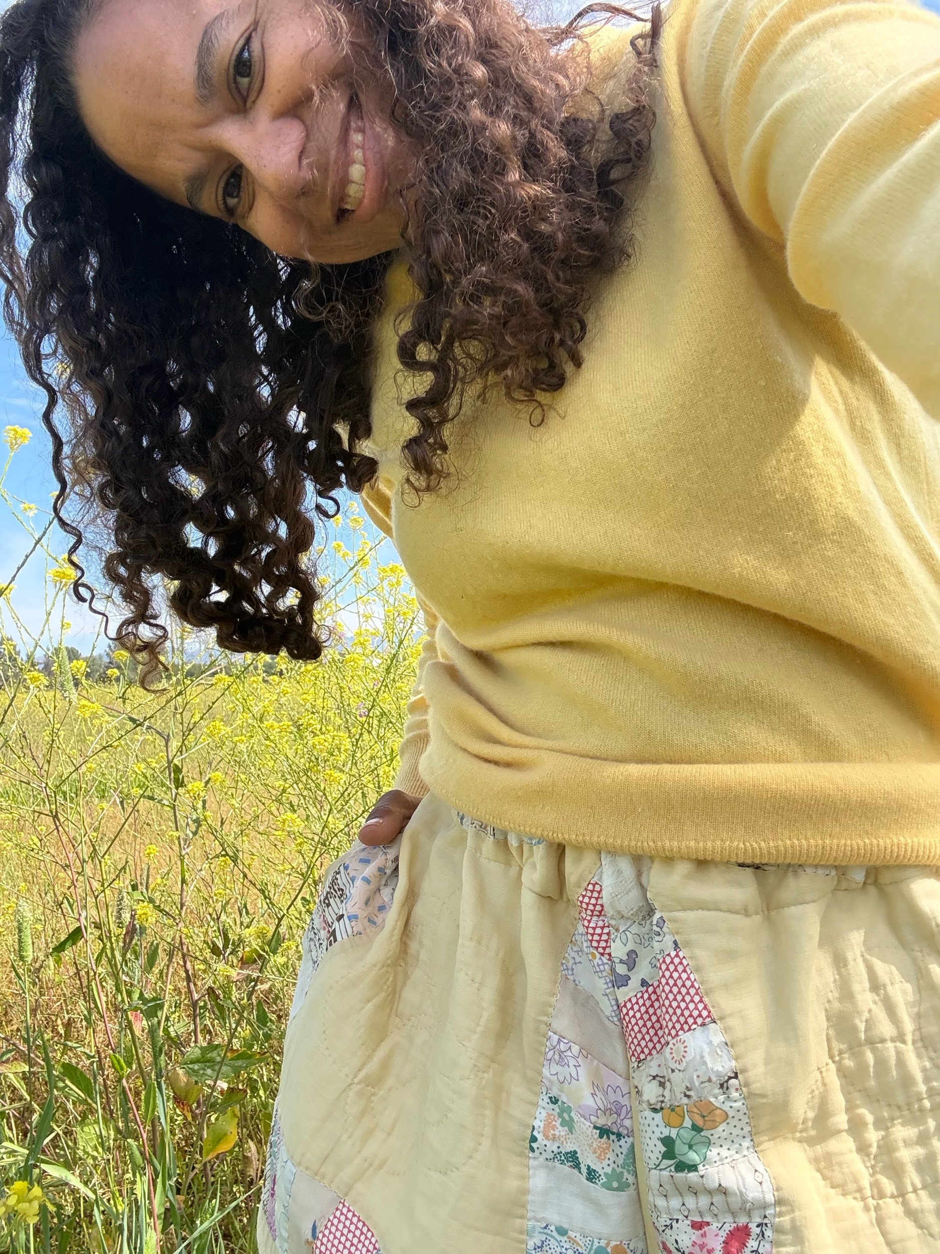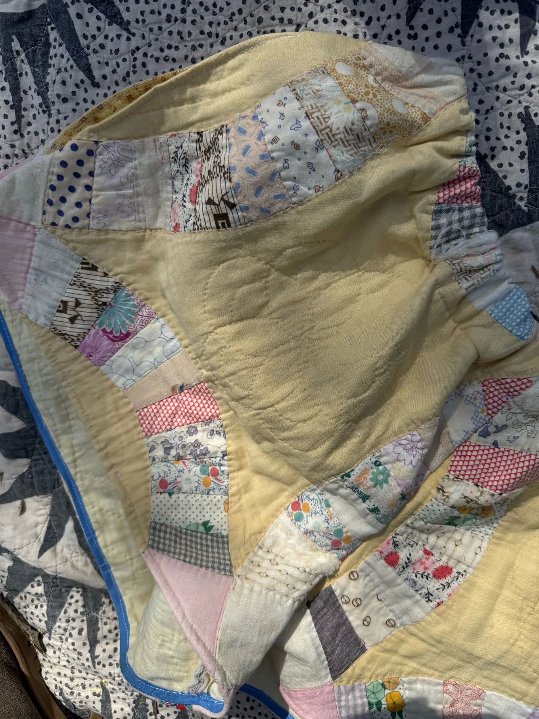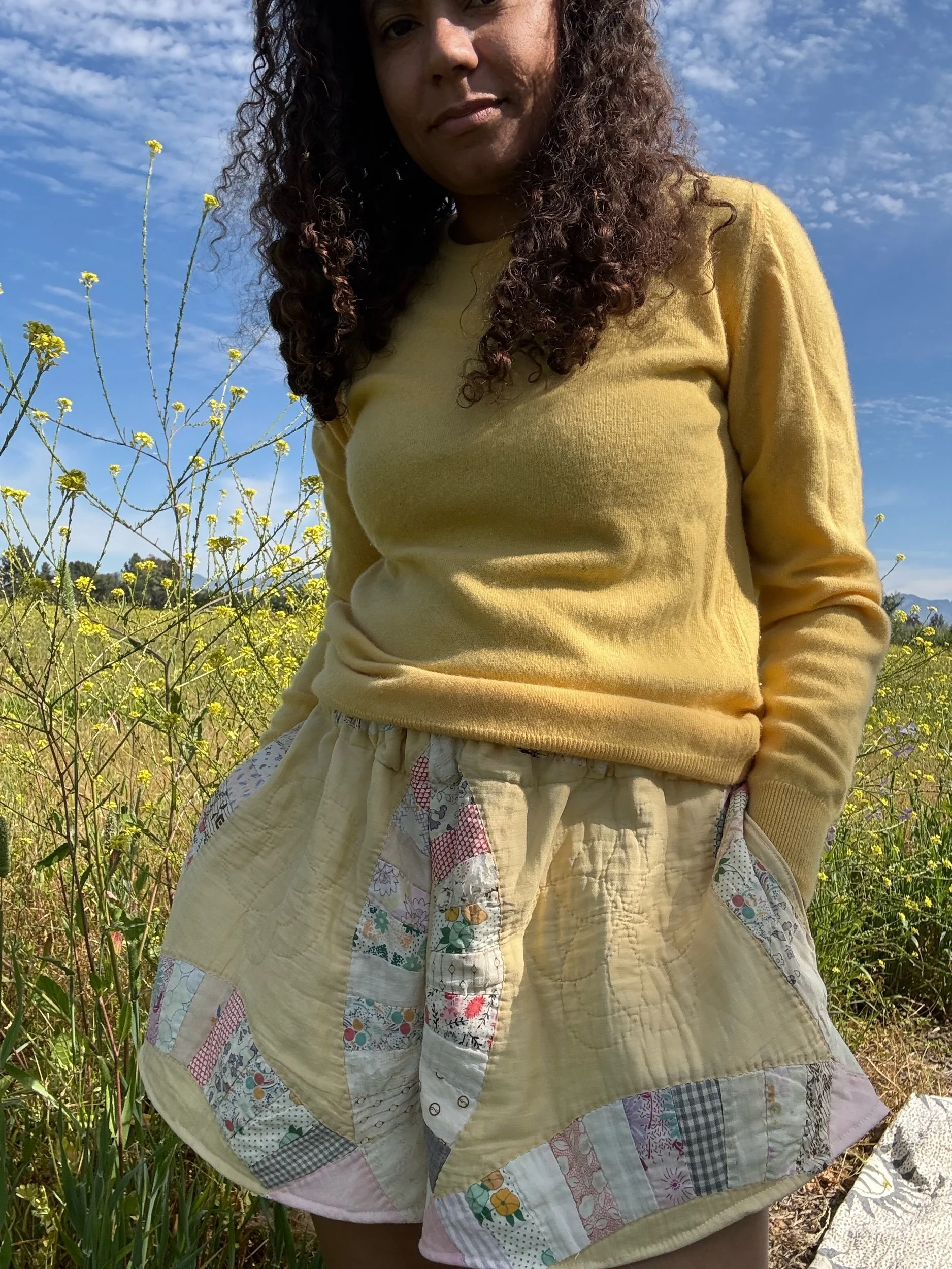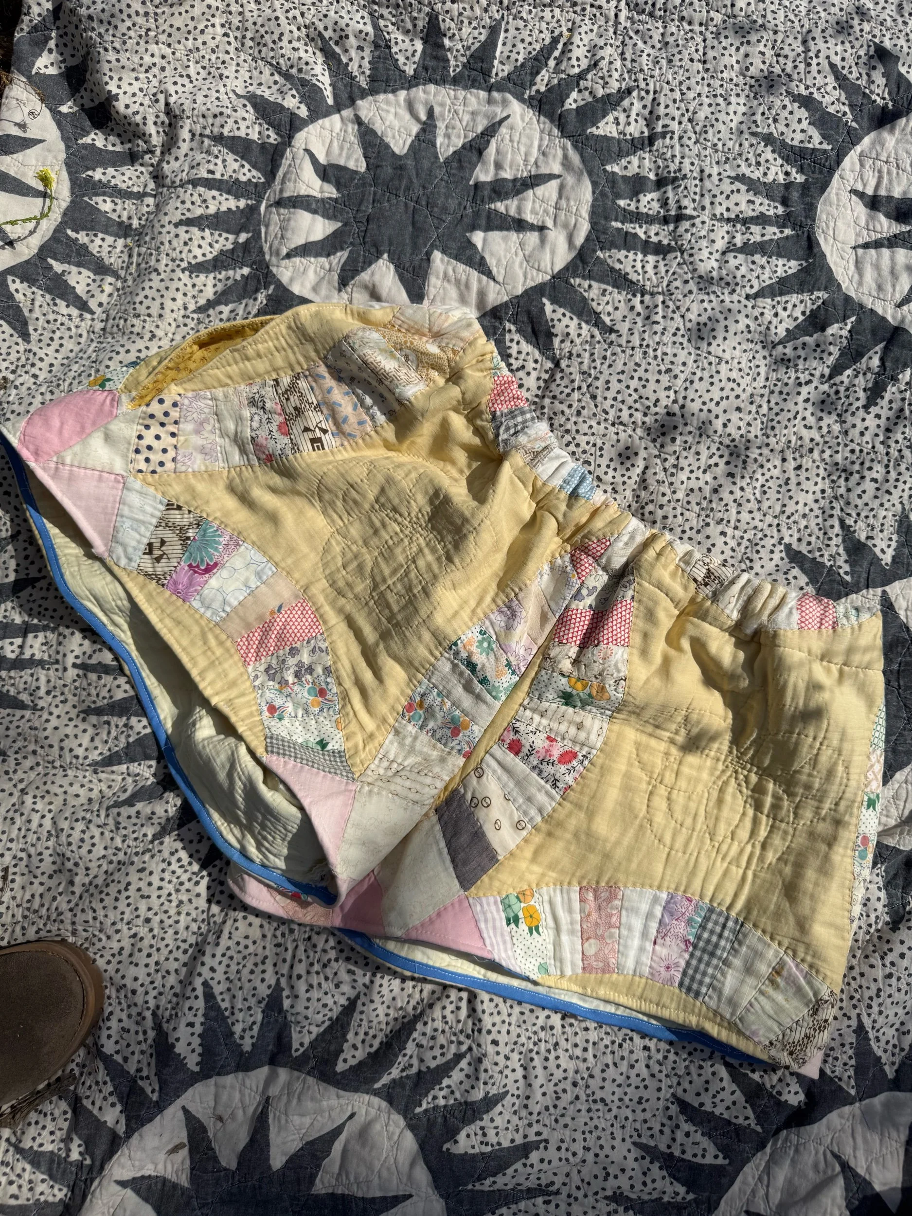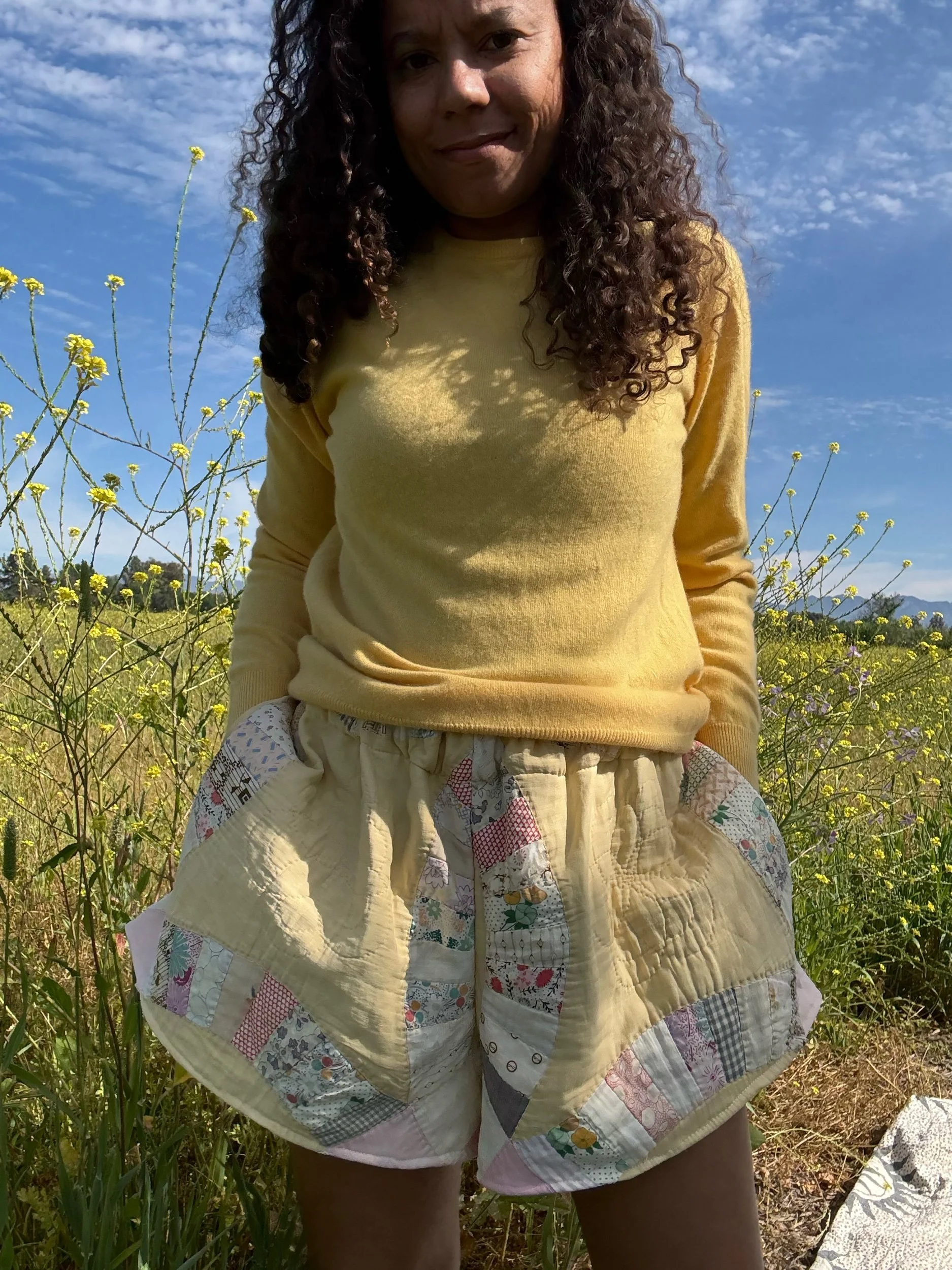 Shorts made from an antique quilt that has signs of wear that add to its charm and story. Perfect for wearing while collecting wild flowers or planting native milkweed. Also perfect for lounging and walking, because they’re light, soft, and cozy all at the same time.